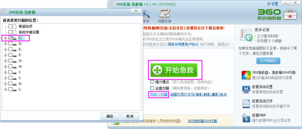 6、选择自定义扫描,选择系统盘“C盘”,按“开始急救”按钮;