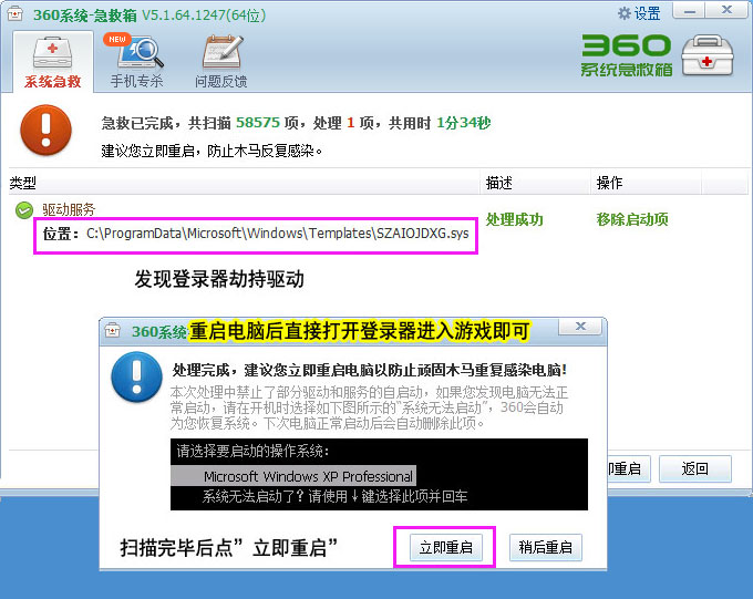 7、查到劫持木马,清除它,并重启电脑。